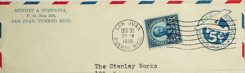 1517 Oc UC1 var. image#UC1 var., 5c Blue on white, die 1, border type b, "1933" watermark, UPSS die AM1, size 13, knife 78, wmk. 33, a very scarce used entire issued specifically for use in Puerto Rico, St. Thomas and the Virgin Islands, proper period "San Juan, Puerto Rico/Dec. 30, 1935" machine cancel, opened at bottom, very fine; 1971 PF certificate (UPSS #AM-4-33). (Image) UPSS 750.00