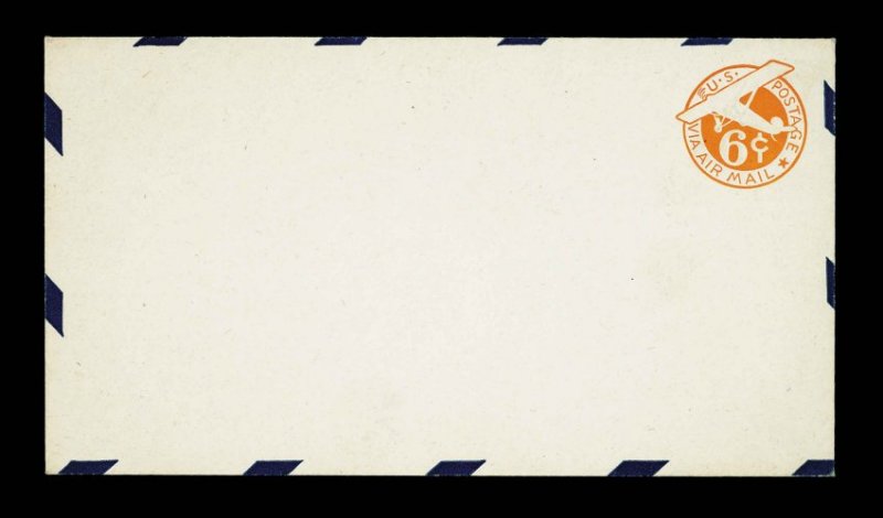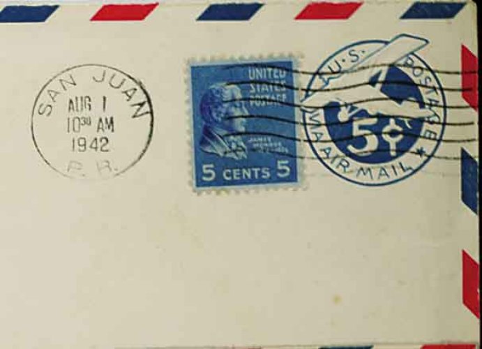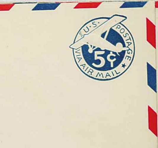 1518 Oc UC1 var. image#UC1 var., 5c Blue on white, die 1, border type d, "1937" watermark, UPSS die AM1, size 23, knife 106, wmk. 36, an extremely rare used example of this entire which was specifically issued for use in Puerto Rico, St. Thomas and the Virgin Islands, this being the especially elusive "d" border which is only found on the larger sized entire, censored usage to Washington, D.C. with "San Juan, P.R./Aug 1, 1942" machine postmark, light vertical bend, very fine; one of the great rarities of all the air mail entires; ex-White (UPSS #AM-6-36). (Image) 2,500.00
