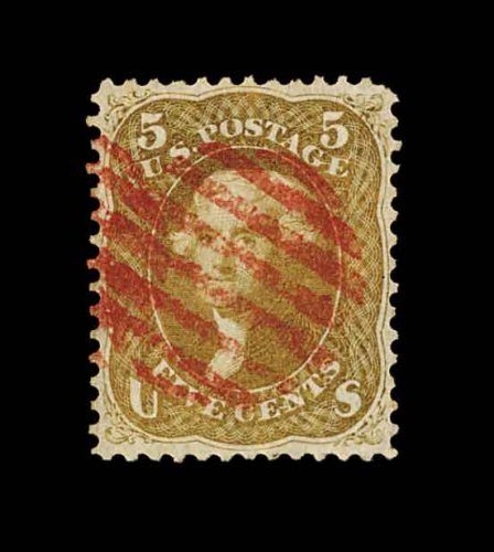 142 O 67b image#67b, 5c Olive yellow, a superb example of the elusive Olive yellow (or so-called "Mustard") shade, possessing flawless centering, with its perforations clearing the design all around which is a most uncommon occurrence on all the Five Cent 1861 shades, strong luxuriant color and impression, light face-free cancels confined to bottom right, extremely fine; a true condition rarity in this gem quality; 1994 PF certificate. (Image) 950.00
