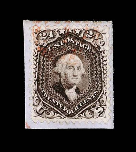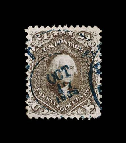 150 O 70a image#70a, 24c Brown lilac, especially choice used example of this elusive shade, exceptionally well centered within much larger margins than typically associated with any of the Twenty Four Cent 1861-62 values, bold rich color and a sharp detailed impression on bright paper, wonderfully postmarked with a central yet unobtrusive blue town c.d.s., extremely fine gem; a beautiful stamp; 1992 PF certificate. (Image) 135.00