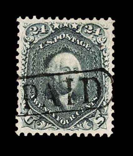 151 O 70b image#70b, 24c Steel blue, an incomparable used example of this rare and challenging shade, featuring numerous physical qualities that simply cannot be improved upon, not the least of which is its absolutely perfect centering amid extravagantly large margins, its color possesses the true early Steel blue hue in a remarkably rich shade, plus its impression is razor-sharp on bright paper, unusually even and intact perforations all around, exquisitely postmarked with a choice upright and complete strike of a boxed "PAID" cancel, the epitome of a superb used classic; a stamp for the finest used collection; 1986 PF certificate. (Image) 615.00