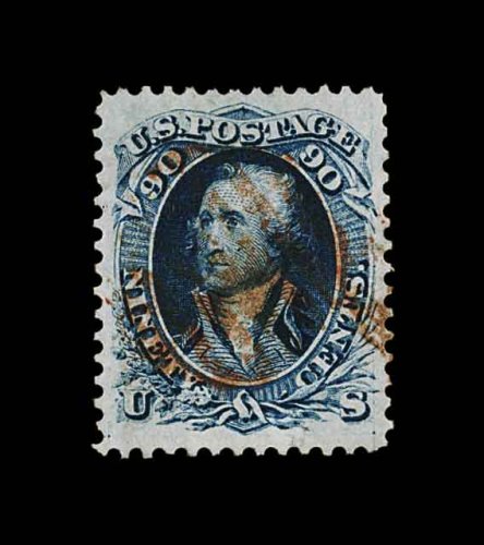 155 O 72 image#72, 90c Blue, perfectly centered, with lavishly large margins, eye-arresting color in a most intense rich shade, prooflike impression on bright paper, even its perforations are out of the ordinary, being unusually full and intact, wonderfully postmarked with a town c.d.s., which is an uncommon occurrence for a high value, an extremely fine gem; a superb stamp in every regard; one of the finest used #72's we have ever seen offered at auction; 1991 PF certificate. (Image) 400.00