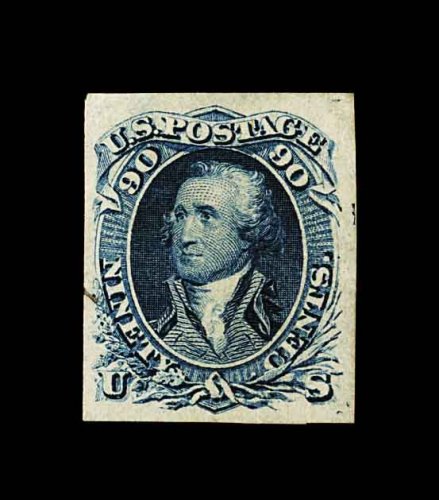 159 O 72 var. image#72 var., 90c Blue, imperforate presentation copy, four wide margins, deep luxuriant color, just a trace of the typical manuscript obliteration at bottom left, extremely fine and rare; an unusually choice example of this imperforate variety, as the majority of the few known examples are found with a much more prominent obliteration which typically defaces the stamp; 1999 PF certificate; ex-Brazer. (Image) Est. 1,500-2,000