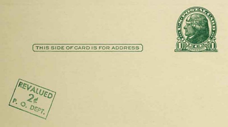 1581 ogc UX41 var. image#UX41 var., 2c on 1c Green on buff, diagonal surcharge group of three cards, each displaying different surcharge positioning, one (type 4) partially overlaps the indicia, another (type 3) is lower left, and the third (type 1) is at the far left edge, choice very fine and scarce; represents 3 of the 18 total cards available from the original single error sheet of 20; ex-Beachboard (USPCC #S57k). (Image) USPCC 1,350.00