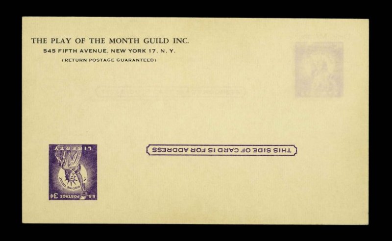 1584 ogc UX46d image#UX46d, 3c Liberty, indicia omitted, stark mint card, normal address inscription with the Statue of Liberty stamp impression completely omitted, crisp on bright stock, extremely fine; listed but unpriced in Scott; 2000 PF certificate (USPCC #S63d). (Image) USPCC 450.00