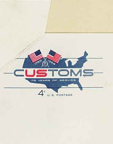 1593 ogc UX50 var. image#UX50 var., 4c Customs, double red impression, a stunning example of this mint card, not only for its distinct and discernible doubling of the red impression (in flags and "US" of "CUSTOMS"), but its extraordinary foldover (which probably caused the doubling error), extremely fine and rare; unlisted in both Scott and USPCC; ex-Beachboard (USPCC #S68 var.). (Image) Est. 750-1,000