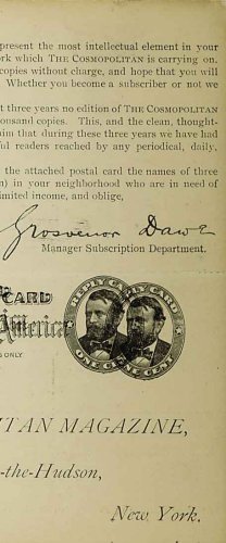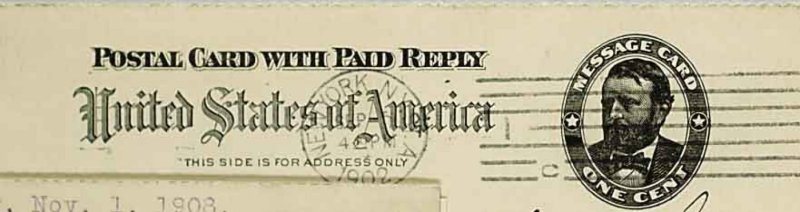 1630 ogc UY3 var. image#UY3 var., 1c + 1c Black on buff, paid reply postal card, message side normal, reply side with double impression, a very scarce unused example of this error, stunning bold double horizontal impression on reply card, separation 1, folded with preprinted Cosmopolitan Magazine address and advertisement message, lightly toned, still very fine and extremely attractive; woefully undercataloged as this item realized an impressive $825.00 in its last appearance at auction; ex-Beachboard (USPCC #MR5f). (Image) USPCC 200.00+
