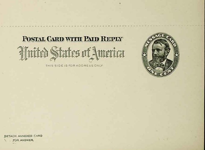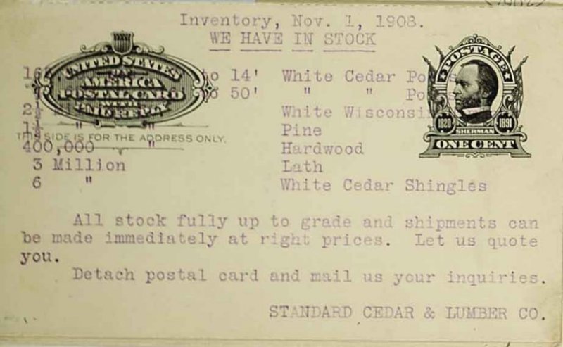 1634 ogc UY4b image#UY4b, 1c + 1c Black on buff, paid reply postal card, message card printed on both sides, reply card blank, a very scarce unused folded example, preprinted with lumber company inventory, very fine and rare as this is the unique unused example; unpriced in both Scott and USPCC; ex-Beachboard (USPCC #MR6c). (Image) Est. 500-750