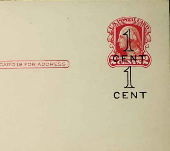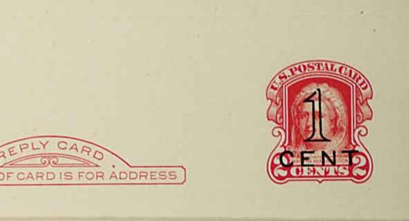 1636 ogc UY10 var. image#UY10 var., "1 cent" Press printed surcharge on 2c + 2c Red on buff, paid reply postal card, double surcharge on message card, mint card, folded with small separation right, two bold and distinct vertical surcharges on message side, very fine and extremely rare as this is the only known example of any type; ex-Beachboard (USPCC #MR17a). (Image) Est. 500-750