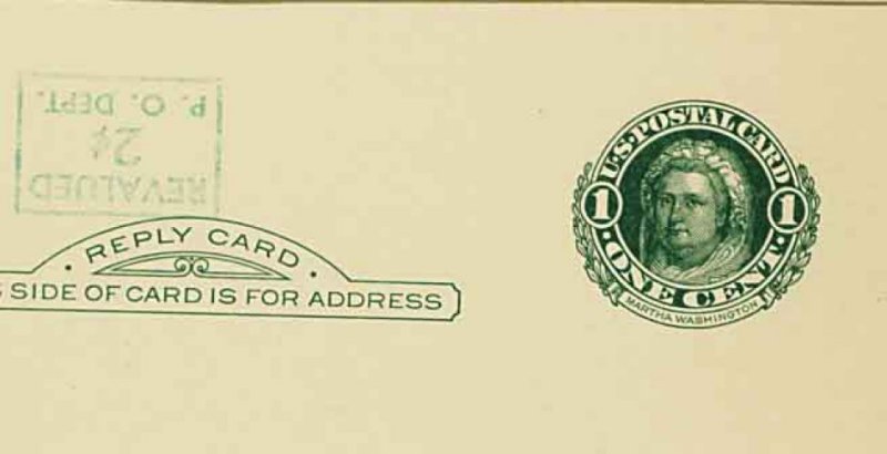 1638 ogc UY14c image#UY14c, 2c on 1c + 1c Green on buff, paid reply postal card, horizontally inverted surcharges, a very scarce mint unfolded example, distinct light green surcharges horizontally inverted to left of the indicias on both halves, a couple of trivial corner bends, choice very fine (USPCC #MR23-4). (Image) USPCC 300.00