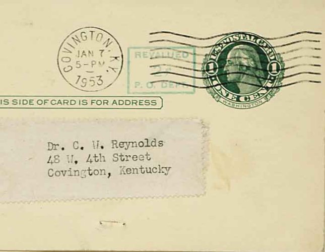 1639 Oc UY14m var. image#UY14m var., 2c on 1c + 1c Green on buff, paid reply postal card, Cincinnati surcharge, used detached 1c Washington message card, with bluish-green Cincinnati official facsimile surcharge, postmarked "Covington, Ky/Jan 7 1953", printed communicable disease form on reverse, tiny staple hole at bottom, still very fine and scarce; 1990 APS certificate (USPCC #M23-5). (Image) USPCC 325.00+