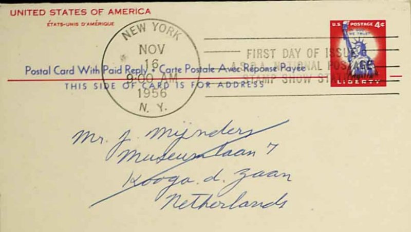 1640 F UY16 var. image#UY16 var., 4c + 4c Liberty International, paid reply postal card, double ultramarine impression on both cards, scarce First Day cover, used unsevered, ASDA slogan postmark dated November 16, 1956 on card sent to Kooga d. Zaan, Netherlands, receiver c.d.s. on reply card, light ultramarine doubling on both halves, very fine and unusual (USPCC #MR26ab). (Image) Est. 300-400