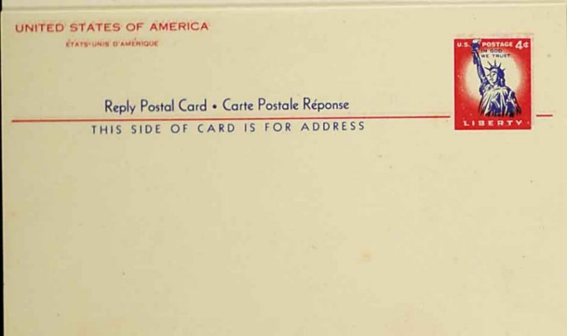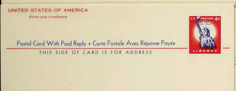 1642 ogc UY16b var. image#UY16b var., 4c + 4c Liberty International, paid reply postal card, reply card printed on both halves, double scarlet impression on one card, fresh mint example, distinct color doubling on one card, bright and clean, choice very fine and rare as only one known mint example (USPCC #MR26ba). (Image) Est. 300-400