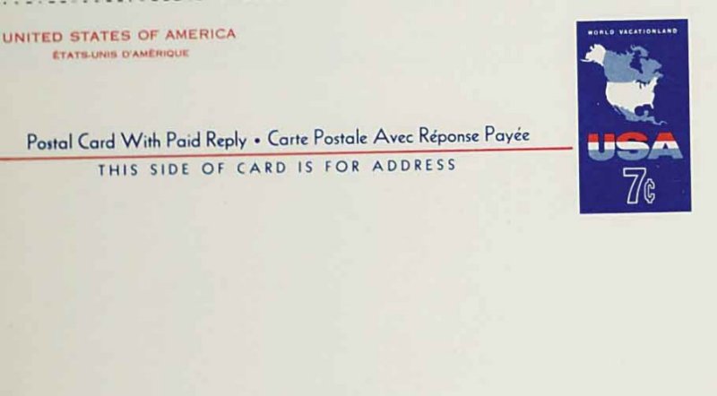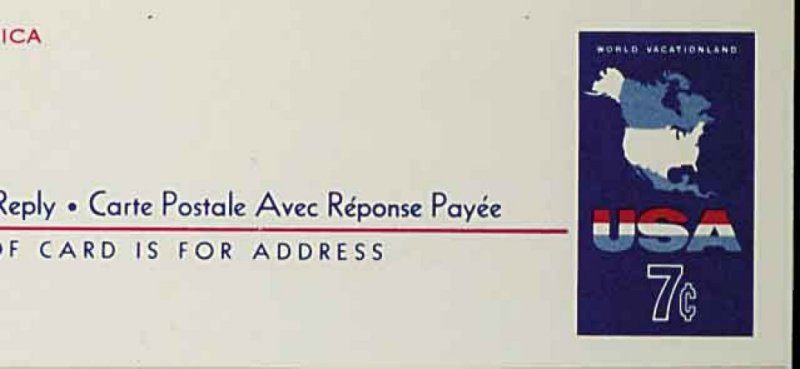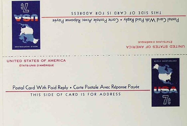 1645 ogc UY19a image#UY19a, 7c + 7c Map International, paid reply postal card, message card normal, reply card blank, a very fresh mint unfolded example, exceptionally bright and choice, extremely fine (USPCC #MR29b). (Image) USPCC 200.00