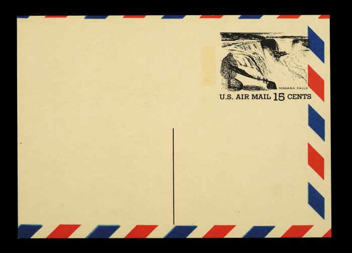 1658 ogc UXC13 var. image#UXC13 var., 15c Niagara Falls, blue lozenges doubled, lozenges misplaced, stunning mint card, dramatically misplaced lozenges, sides shifted 7mm left, with top and bottom shifted up 2mm, in addition, there is a distinct doubling of the blue color, fresh and clean, extremely fine and believed to be unique; an extraordinary double error that is unlisted in both Scott and USPCC; ex-Beachboard (USPCC #SA12-2 var.). (Image) Est. 3,000-4,000