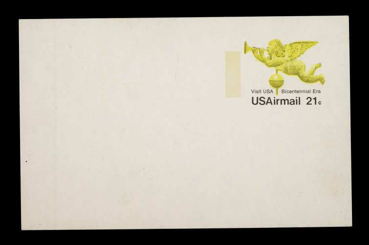 1660 ogc UXC16a image#UXC16a, 21c Angel Weather Vane, red and blue colors omitted, pristine mint card, displaying a striking multiple color omission error, making this card one of the most popular and desirable modern errors in U.S. philately, fresh and bright, extremely fine and rare as only three are known to exist; unpriced in Scott and USPCC, this card was the centerpiece of the Beachboard Sale (Matthew Bennett, Inc., sale #231), where it realized an impressive $12,650.00 in highly competitive bidding; 2001 PF certificate; ex-Beachboard (USPCC #SA15a). (Image) Est. 7,500-10,000