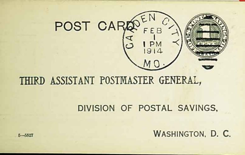 1663 Oc UZ1 var. image#UZ1 var., 1c Black official, colorless dot between "O" & "S" of "POSTAGE", fresh used card, postmarked "Garden City, Mo./Feb 1 1914", displaying the visibly distinct constant plate variety at upper left of the indicia, usual Postal Savings preprinted address and report, choice very fine and scarce; ex-Beachboard (USPCC #O1a). (Image) USPCC 325.00
