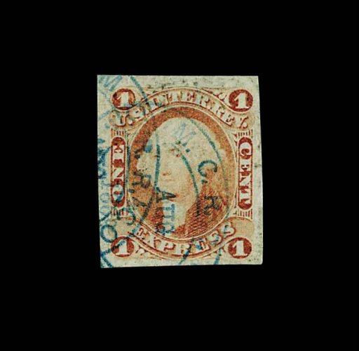 1666 O R1a image#R1a, 1c Express, imperforate, select used example, four exceptionally large and well balanced margins, bright color, attractively cancelled with a blue Michigan Central R.R. double oval, extremely fine. (Image) 55.00