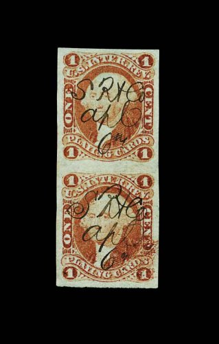 1667 O R2a image#R2a, 1c Playing Cards, imperforate, an extraordinary quality used vertical pair of this scarce stamp, featuring lavishly large and well balanced margins all around, deep rich color (showing a printer's ink smear in bottom stamp), neat and unobtrusive manuscript cancel, extremely fine and exceedingly choice; the finest quality pair known among the five pairs listed in the Curtis census; 2001 PF certificate; ex-Zoellner. (Image) 2,200.00
