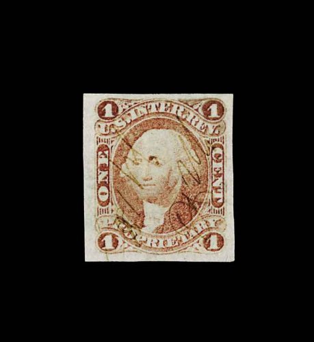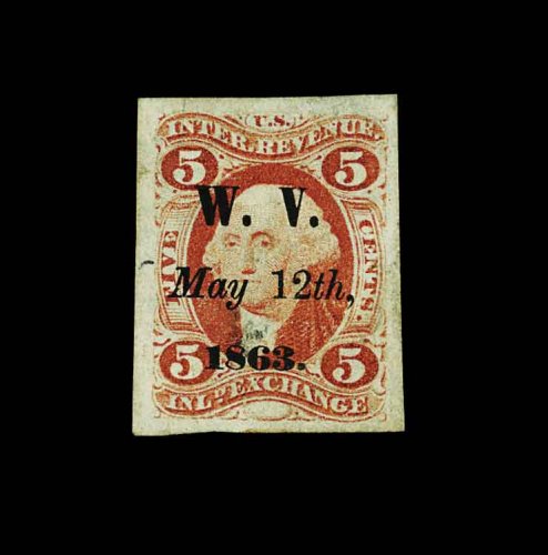 1675 O R27a image#R27a, 5c Inland Exchange, imperforate, huge margins all around, deep luxuriant color, perfectly printed "W.V./May 12th, 1863." cancel, an extremely fine gem in every regard; ex-Joyce and Zoellner. (Image) Est. 100-150