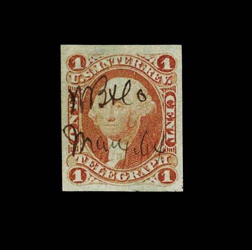 1669 O R4a image#R4a, 1c Telegraph, imperforate, four large and perfectly symmetrical margins, deep rich color, neat manuscript cancel, small marginal tear at bottom not mentioned on accompanying certificate, otherwise extremely fine; clear 1981 PF certificate. (Image) 375.00