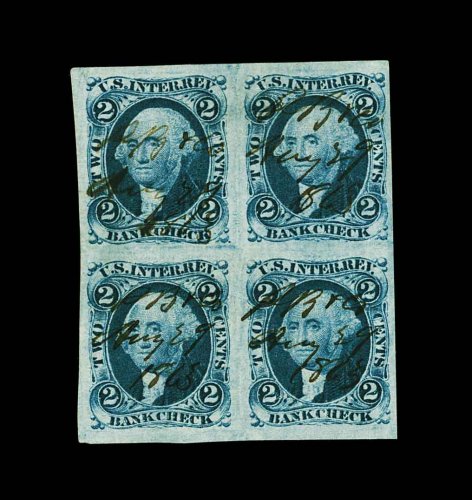 1670 Obl R5a image#R5a, 2c Bank Check, imperforate, handsome used block of four, large to mostly huge margins all around, deep rich color, neat manuscript cancels, bottom right stamp with couple of pinholes, otherwise extremely fine; one of the most attractive used multiples available; ex-Zoellner. (Image) 90.00
