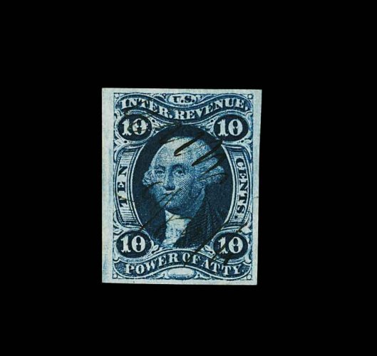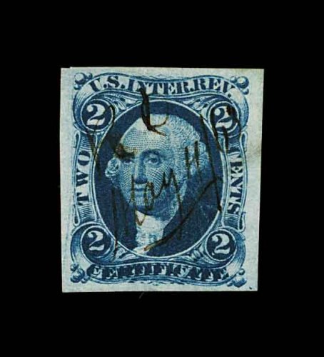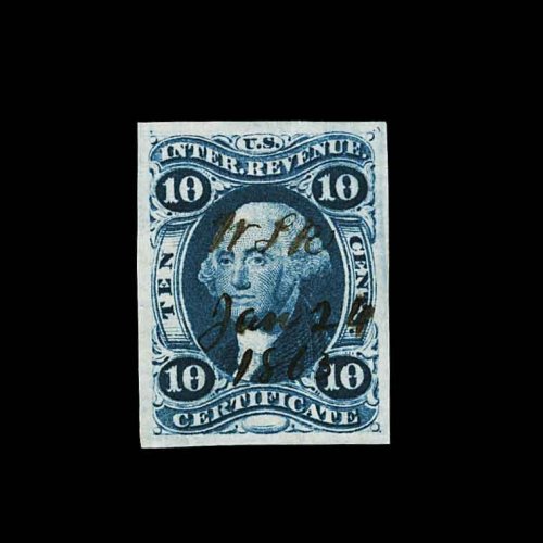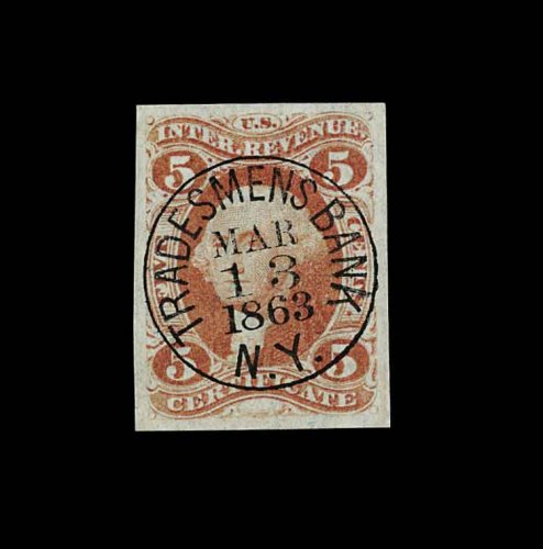 1674 O R24a image#R24a, 5c Certificate, imperforate, four large and balanced margins, prooflike color and impression on bright paper, perfect central strike of "Tradesmens Bank, N.Y./Mar 13, 1863" datestamp, superb; a gem for the perfectionist; ex-Joyce and Zoellner. (Image) Est. 100-150