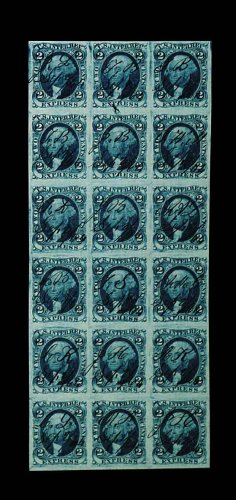 1672 Obl R9a image#R9a, 2c Express, imperforate, a striking used block of eighteen (3 x 6) in exceptional quality, pos. 6-8/76-78, possessing large even margins all around, bright fresh color and clean paper, each with neat manuscript cancel, extremely fine; the largest available multiple of this stamp according to the Curtis census (two others exist); cataloged as three blocks of four and three pairs; ex-Joyce. (Image) 435.00+