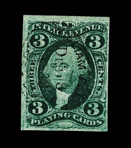 1673 O R17a image#R17a, 3c Playing Cards, imperforate, an incredibly choice used example of this important first issue revenue rarity, being one of the few existing copies that is both sound and with a desirable handstamp cancel, completely free of the flaws that affect most existing examples, with four large to very large margins, especially deep luxuriant color, wonderfully cancelled with a light central strike of an oval handstamp cancel dated December 8, 1863, very fine; one of the most desirable Three Cent imperforate Playing Cards to be offered in years; 1982 and 1992 PF certificates; ex-Lyons. (Image) 9,500.00