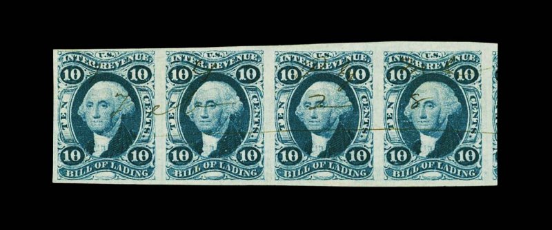 1676 O R32a image#R32a, 10c Bill of Lading, imperforate, scarce horizontal strip of four, pos. 105-108, ample to mainly huge margins, including a portion of the adjacent stamp at right, light manuscript cancel, two tiny tears in the left margin, otherwise extremely fine and handsome; cataloged as two pairs; ex-Joyce. (Image) 280.00+