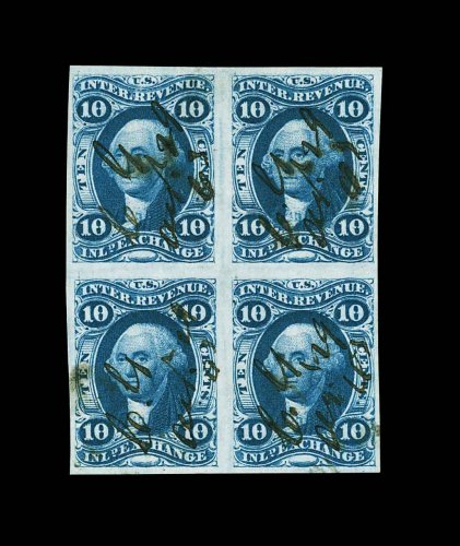 1678 Obl R36a image#R36a, 10c Inland Exchange, imperforate, an exceptional quality used block of four, being the only recorded used block of four according to the Curtis census, large margins all around, especially deep and luxuriant color, each stamp with 1863 manuscript cancel, extremely fine; an important first issue revenue multiple; ex-Joyce. (Image) 1,050.00