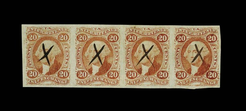 1680 O R42a image#R42a, 20c Inland Exchange, imperforate, an incredibly handsome horizontal strip of four, lavishly margined all around, wonderfully bright color and paper, neat manuscript "X" cancels, extremely fine; one of only two recorded horizontal strips of four according to the Curtis census; cataloged as two pairs; ex-Joyce. (Image) 120.00+