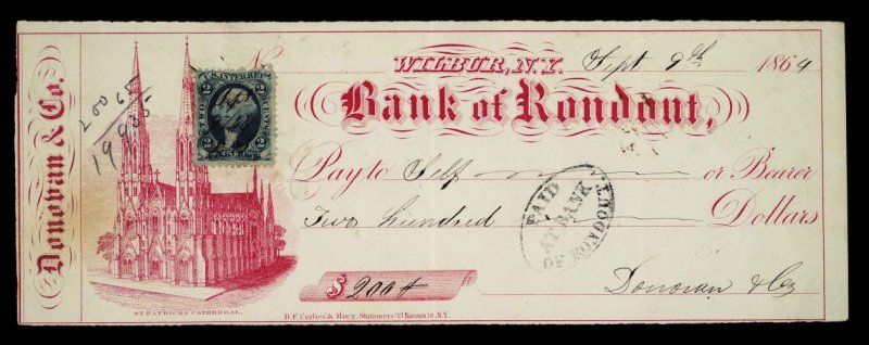 1742 c R5c var. image#R5c, 2c Bank Check, double transfer (T5), showing impressive doubling of the "Bank Check" lettering at bottom, used on 1864 Wilbur, N.Y. Bank of Rondout check, showing illustration of St. Patrick's cathedral, neat manuscript dated cancel on stamp, well centered, faint tone spot on check at far left, very fine; ex-Joyce and Zoellner. (Image) Est. 150-200