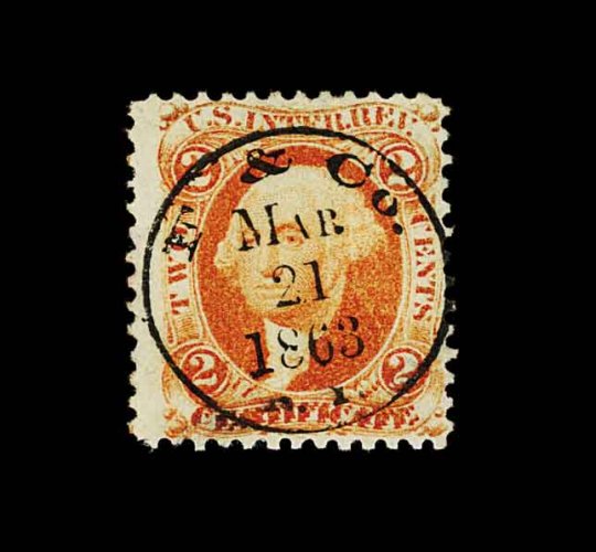 1743 O R8c image#R8c, 2c Certificate, double transfer (T7), choice used example of this striking and scarce double transfer variety, showing dramatic doubling of "Certificate" at bottom, vivid color and impression, nicely centered, superb socked-on-the-nose "F. & Co./Mar 21, 1863" circular handstamp, very fine. (Image) 350.00