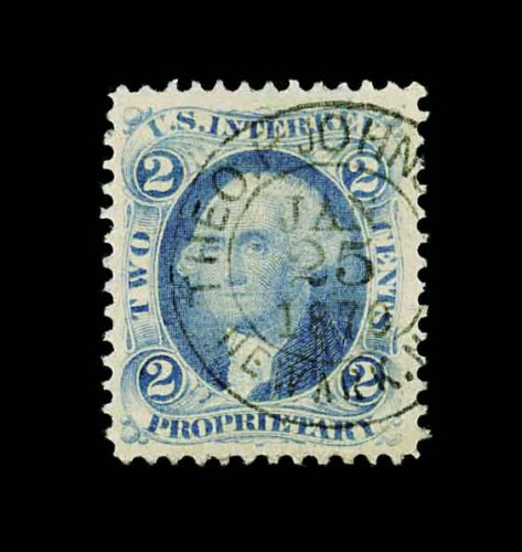 1744 O R13c var. image#R13c var., 2c Proprietary, Pale milky blue, choice example of this very scarce and distinctive shade, printed on most unusual thick porous paper, bright color, exceptionally well centered and margined, well struck Jan. 25, 1870 handstamp cancel, extremely fine; 1991 PF certificate; ex-Joyce and Zoellner. (Image) Est. 300-400