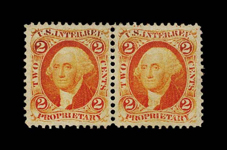 1745 ng R14c image#R14c, 2c Proprietary, orange, very scarce unused horizontal pair, radiant color, exceptionally well centered, extremely fine and handsome; unpriced in Scott as unused; 1991 PF certificate; ex-Joyce and Zoellner. (Image) as used 275.00