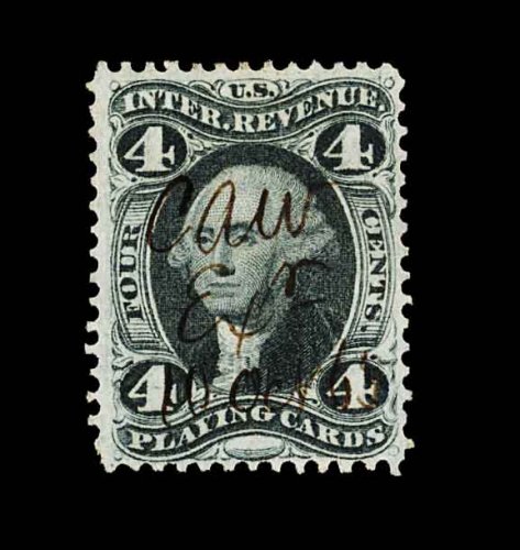 1748 O R21c image#R21c, 4c Playing Cards, quite well centered for this, deep rich color that is far more intense than usual, neat and light manuscript cancel, very fine; 1998 PF certificate. (Image) 500.00