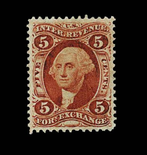 1749 og R26d image#R26d, 5c Foreign Exchange, silk paper variety, a gem mint example of this very scarce stamp, virtually perfect centering within large margins, deep prooflike color and impression, still retaining a large portion of its original gum, extremely fine; highly desirable in this choice condition; 1980 PF certificate; ex-Gaudio and Lyons. (Image) as used 300.00