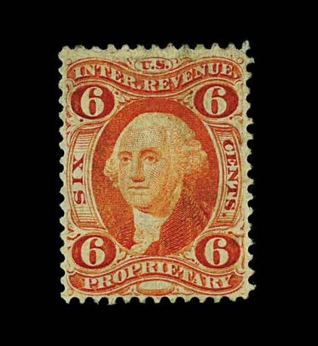 1751 O R31c image#R31c, 6c Proprietary, an extraordinary quality example of one of the most difficult of all United States issues to find in premium condition, as most known examples, according to the footnote found in the Scott catalog, are "faulty or repaired and poorly centered", the particular example offered here is completely free of the reparations found on most and possesses exceptional centering, even its color is out of the ordinary, being quite fresh and vibrant, faintly cancelled, with the exception of a truly insignificant surface scrape to the perforation tip in the top right corner (could easily be removed) this copy is completely free of the characteristic flaws affecting nearly every known example, very fine; a rare opportunity to acquire this important revenue rarity in outstanding condition; the catalog value quoted in Scott is for a fine centered copy with faults and does not accurately reflect this particular example's true market value; 1986 PF certificate; ex-Handy. (Image) 1,600.00