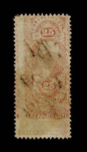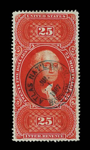 1757 O R100c image#R100c, $25.00 Mortgage, a stunning used example in extraordinary quality, featuring outstanding centering amid lavishly large margins, plus its color is an eye-arresting intense shade and its impression deeply etched, wonderfully cancelled with a central strike of a blue double ring "Atlas Nat'l Bank/Jul 1 1867/Boston" handstamp, an extremely fine gem in every regard; ex-Handy. (Image) 115.00