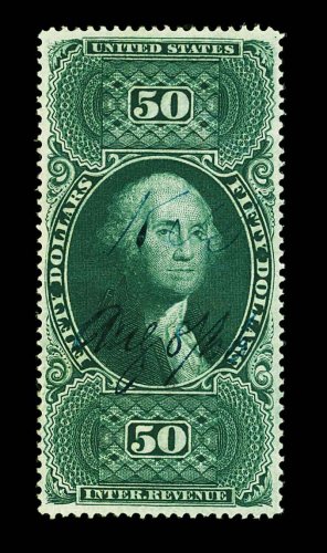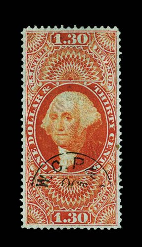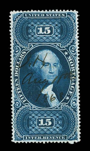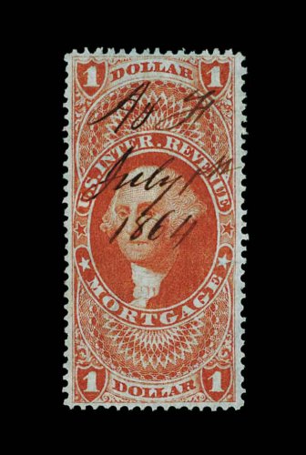 1753 O R73c image#R73c, $1.00 Mortgage, uncharacteristically well centered, bright fresh color and paper, neat 1864 manuscript cancel, very fine; an exceptionally choice used example of this challenging stamp to find both sound and well centered; 1988 PF certificate; ex-Handy. (Image) 175.00