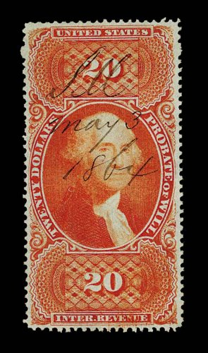 1756 O R99c image#R99c, $20.00 Probate of Will, an extraordinarily handsome and choice used example of this scarce value, brilliantly fresh, with strong vivid color and impression on bright paper, uncharacteristically well centered and margined, neat 1864 manuscript cancel, extremely fine; seldom encountered in this premium condition; 1980 PF certificate; ex-Handy. (Image) 1,050.00