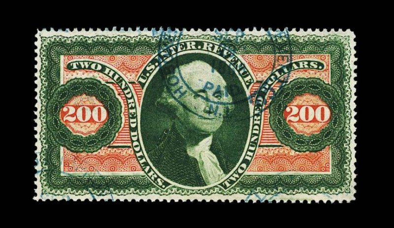 1759 O R102c image#R102c, $200.00 U.S.I.R., a truly outstanding used example, possessing numerous qualities most often lacking on this difficult high value, including being fabulously well centered within symmetrical margins, with incredibly intense colors and a prooflike impression on fresh paper, plus it is neatly cancelled by a clear blue handstamp, extremely fine; by far the nicest example we have seen in many years; 1997 PF certificate for a vertical pair, this being the top stamp. (Image) 650.00