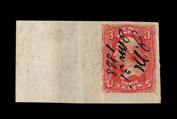 162 O 74a image#74a, 3c Scarlet, imperforate, a striking bottom left corner sheet-margin example, with huge sheet margins and the other margins being quite large, stamp with central manuscript "J.M./ Jan. 31/ 1868" in three lines, thought by students of this rarity to be in the hand of James Macdonough, one of the founders of the National Bank Note Company, with color, impression and paper exactly as found on the existing perforated examples of this trial printing, some creasing of little importance considering the near unique nature of this remarkable imperforate, extremely fine appearance; one of only three recorded Three Cent Scarlets with the manuscript initials and date, one of which is perforated, the other two being imperforate; 1999 PF certificate. (Image) Est. 10,000-15,000