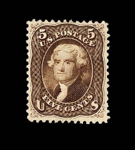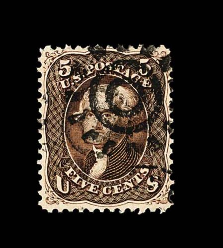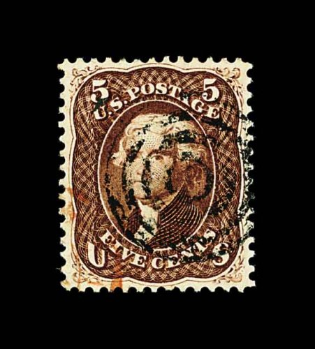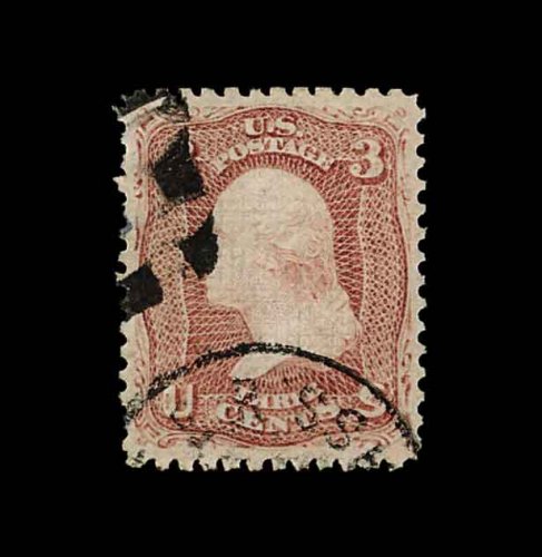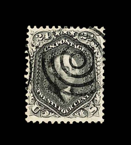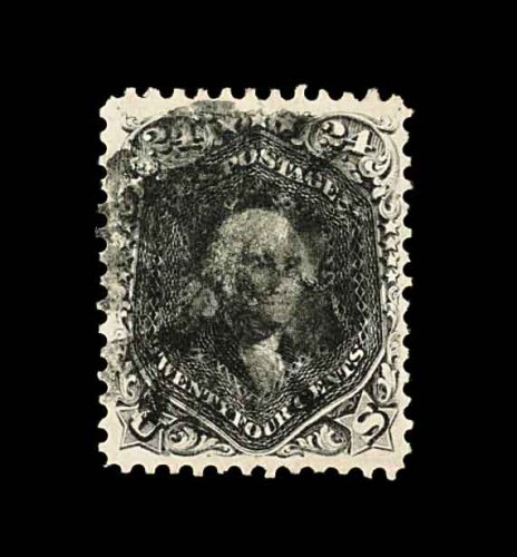 170 O 78c image#78c, 24c Blackish violet, a spectacular used example of one of the rarest and most elusive of all the famous shade varieties found on any 19th century U.S. stamp, being far more difficult to find than the 1857 Indian red, 1861 Pigeon blood pink or 1862 24c Violet, featuring outstanding centering amid unusually wide margins, strong unmistakable blackish violet color and a well defined impression on bright paper, central cork postmark, extremely fine; given the fact that there are only two or three known mint examples of this rare color variety, a used example seems to be an excellent alternative for most collectors, particularly in this premium condition; 1996 PF certificate. (Image) 2,000.00