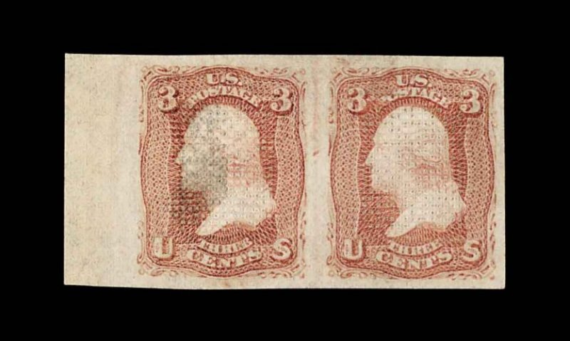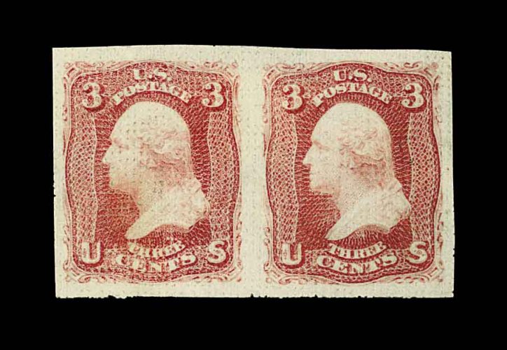 176 og 83a image#83a, 3c Rose, "C" grill, imperforate, left sheet-margin horizontal pair, large margins all around, strong fresh color, full o.g., lightly hinged, extremely fine; rare in any condition, but particularly so this choice; 1983 PF certificate. (Image) 1,850.00