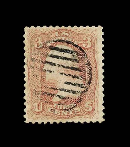 180 O 85C image#85C, 3c Rose, "Z" grill, a gem example of one of the rarest stamps of the 19th century to find in premium quality, possessing outstanding centering amid very large margins, uncommonly rich color and impression on particularly fresh and bright paper, clearly defined grill impression, neat rosette duplex postmark, extremely fine; among the finest known used examples of this very rare "Z" grill, rivaling the gem example sold in the Zoellner collection (Robert A. Siegel Auction Galleries, Inc., October 1998) which sold for $6,250.00, plus the 10% premium; 1993 PF certificate. (Image) 2,750.00