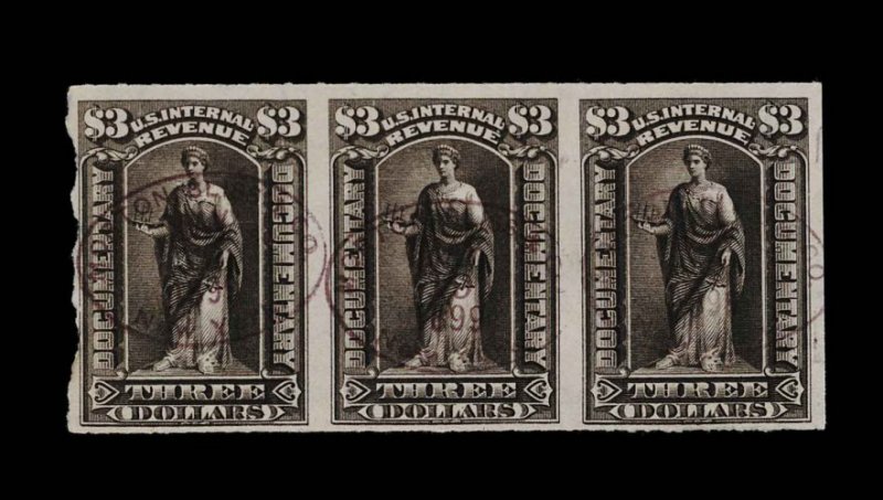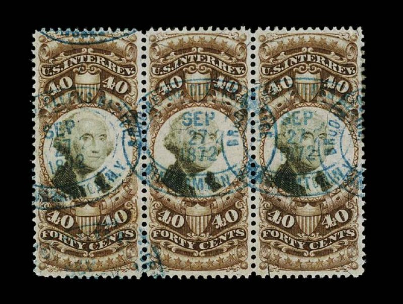 1781 O R141 image#R141, 40c Brown and black, horizontal strip of three, excellent centering, strong rich colors, wonderfully cancelled with blue oval "Broome & Co. Clerks Office/Binghamton, N.Y./Sep 27, 1872" handstamps, right stamp with couple of small corner creases, otherwise extremely fine; a handsome multiple; cataloged as a pair and single. (Image) 152.50+