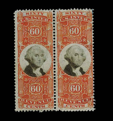 1782 O R142 image#R142, 60c Orange and black, scarce horizontal pair, faint trace of a cancel, strong luxuriant colors, fine; ex-Joyce and Zoellner. (Image) 200.00