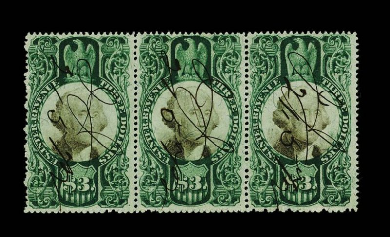 1783 O R147 image#R147, $3.00 Green and black, handsome and scarce horizontal strip of three, rather well centered, sumptuously rich colors, neat manuscript cancels, nearly very fine; cataloged as a pair and single; ex-Joyce and Zoellner. (Image) 137.50+